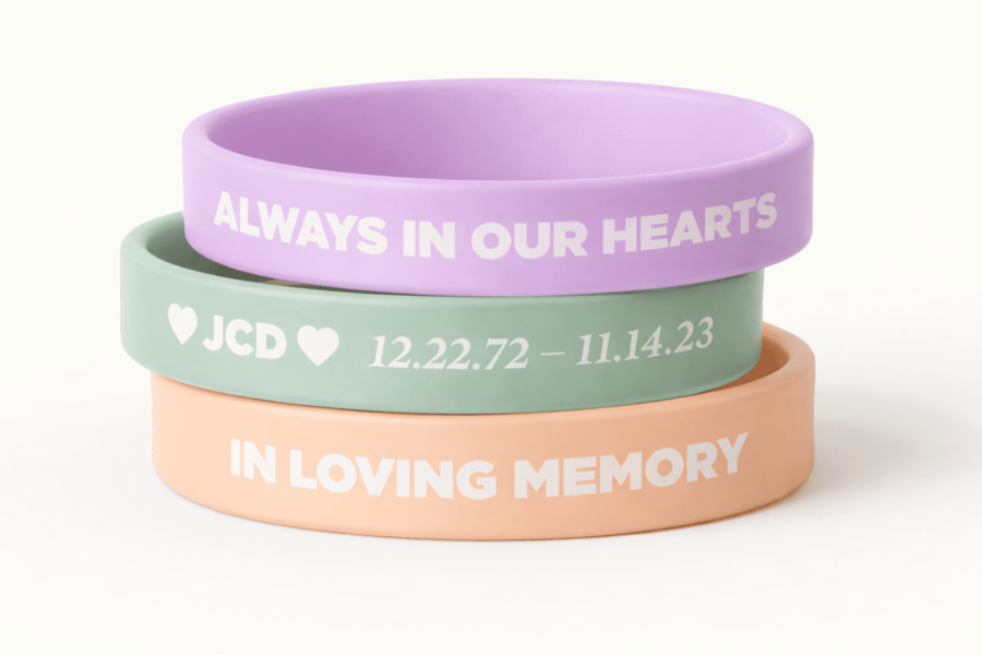 Custom Memorial Wristbands are a meaningful keepsake for all funeral or memorial service attendees, creating a community of support and remembrance.